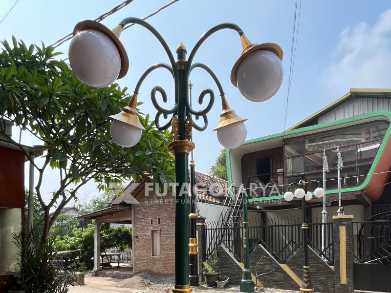 Bagi Anda yang menyukai gaya klasik, tiang lampu dengan ornamen tradisional, seperti ukiran atau bentuk lengkung, bisa menjadi pilihan tepat. Model seperti ini biasanya terbuat dari besi cor yang dicat warna hitam atau tembaga untuk menonjolkan kesan vintage dan mewah.