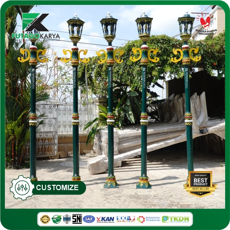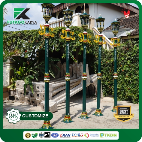 • Ornamen Metal Casting yang Detail: Penambahan aksen dari material pengecoran logam memberikan kesan mewah dan klasik yang tidak bisa didapatkan dari tiang lampu standar.