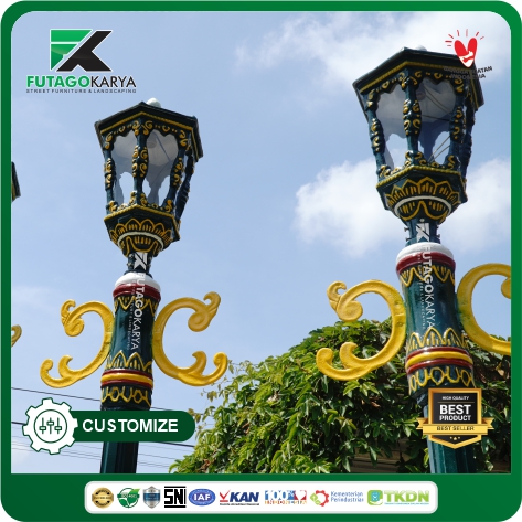 Tiang lampu ini dirancang dengan memadukan kekuatan material pipa besi dan keindahan ornamen khas, menciptakan atmosfer yang hangat dan aman bagi masyarakat sekitar maupun wisatawan yang berkunjung.